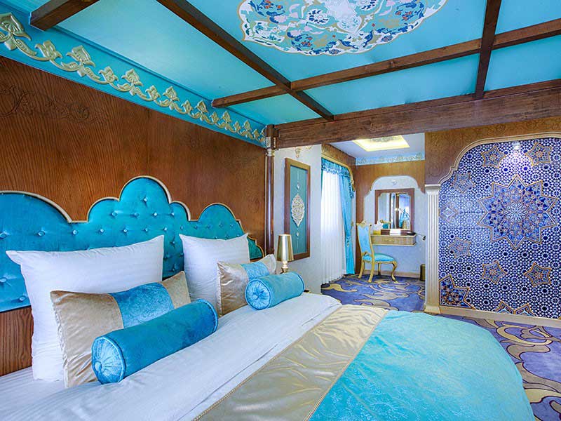 از معماری ایران باستان به سراغ معماری معاصر ایران و عصر صفویه میرویم. سوئیتهای پرزیدنت، هانیمون و یکخوابه و اتاقهای کانکت و اتاق دوتخته سبک صفوی مثل تمام واحدها امکانات رفاهی کامل دارند. صندوق امانات، میز آرایش، سیستم گرمایش و سرمایش مرکزی، یخچال و مینی بار از آن جمله هستند. آینه کاریهای دیوار و سقف به اضافه تلفیقی از فیروزهای و سرخ نمادهای معماری عصر صفوی هستند.