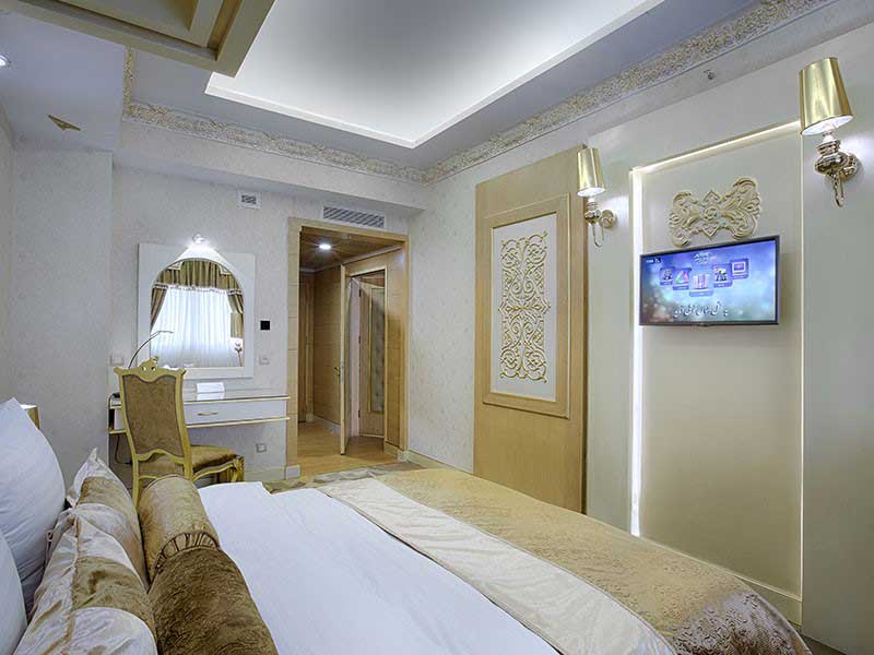 حتی اگر تمام تمدنهای باستانی را کنار هم قرار دهیم، بدون تمدن ایران باستان چیزی کم است. در هتل الماس 2 مشهد هم بخشی از اتاقها به این سبک غنی اختصاص داده شده اند؛ سوئیتهای پرزیدنت، هانی مون و یکخوابه به اضافه اتاقهای کانکت و اتاقهای دوتخته. این اتاقها همانطور که باید انتظار داشته باشید، از سبک معماری پاسارگاد الهام گرفتهاند. نگاهی به گچبریهای روی دیوارها و سقف خود گویای این موضوع است. نورپردازی اتاق هم به نوعی رنگ پردهها، مبلمان و روتختی را برجسته کرده است.