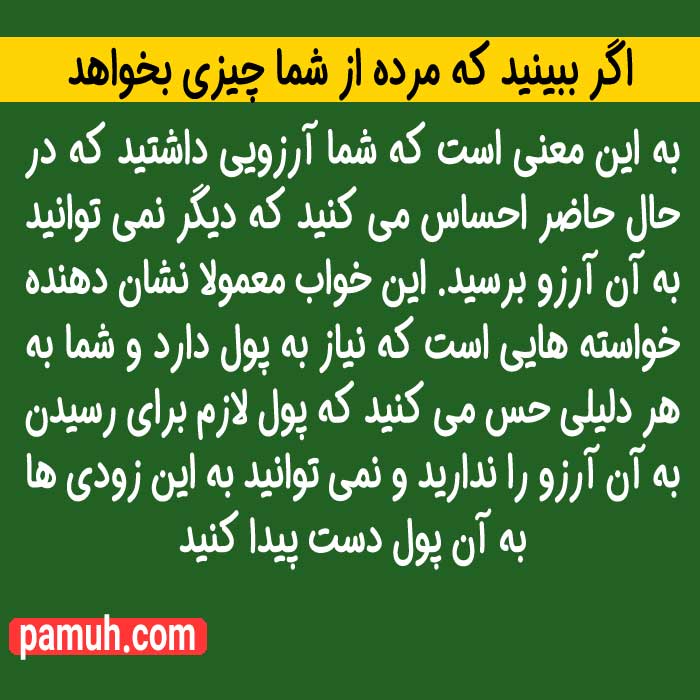 اگر در خواب ببینید که مرده از شما چیزی بخواهد به این معنی است که شما آرزویی داشتید که در حال حاضر احساس می کنید که دیگر نمی توانید به آن آرزو برسید. این خواب معمولا نشان دهنده خواسته هایی است که نیاز به پول دارد و شما به هر دلیلی حس می کنید که پول لازم برای رسیدن به آن آرزو را ندارید و نمی توانید به این زودی ها به آن پول دست پیدا کنید