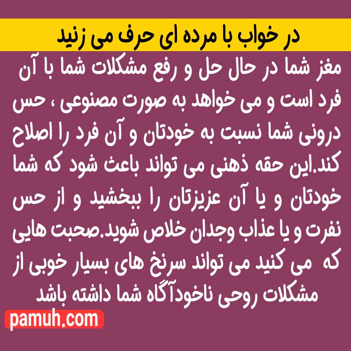 صحبت هایی که شما او می کنید و یا آن فرد مرده در خواب با شما می کند می تواند سرنخ های بسیار خوبی از مشکلات روحی ناخودآگاه شما داشته باشد .