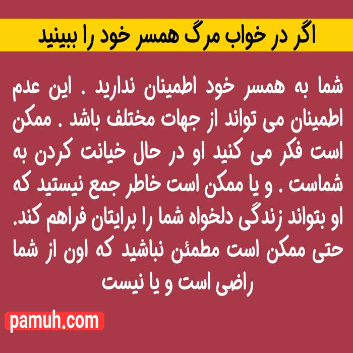 - اگر در خواب مرگ همسر خود را ببینید » این خواب نشان می دهد که شما به همسر خود اطمینان ندارید . این عدم اطمینان می تواند از جهات مختلف باشد . ممکن است فکر می کنید او در حال خیانت کردن به شماست . و یا ممکن است خاطر جمع نیستید که او بتواند زندگی دلخواه شما را برایتان فراهم کند. حتی ممکن است مطمئن نباشید که اون از شما راضی است و یا نیست .