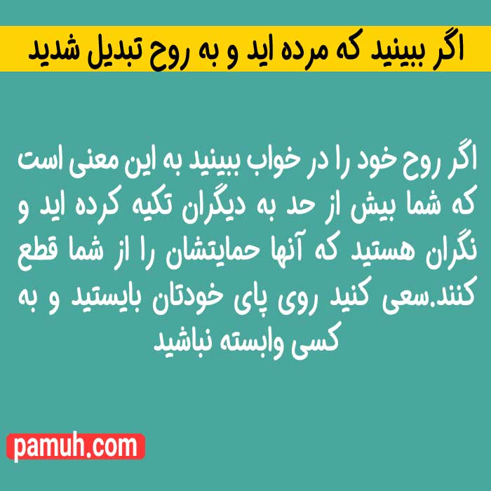 - اگر ببینبد که مرده اید و به روح تبدیل شدید »» اگر روح خود را در خواب ببینید به این معنی است که شما بیش از حد به دیگران تکیه کرده اید و نگران هستید که آنها حمایتشان را از شما قطع کنند.سعی کنید روی پای خودتان بایستید و به کسی وابسته نباشید .