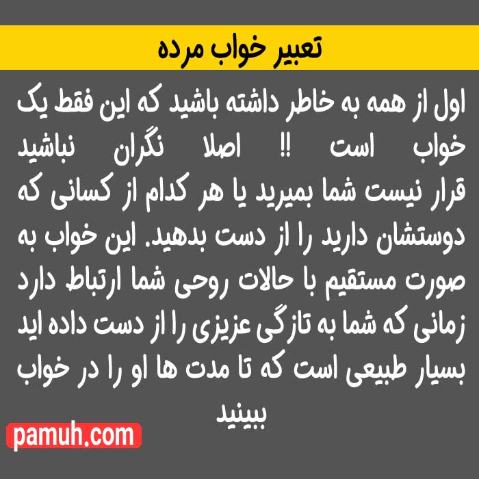 در ادامه این مطلب ، به برخی از سایر تعبیرها درباره "تعبیر خواب مرده " اشاره می کنیم .