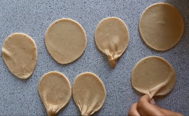 6- بعد پایین هر خمیر رو کمی چین داده و به هم بچسبونید (مثل تصویر پایین). بعد داخل قابلمه روغن بریزید و بگذارید روی حرارت ملایم تا کاملا داغ شود زمانی که روغن کاملا داغ شد زیر حرارت رو کم کنید و خمیر های آماده شده رو داخلش بریزید و هر دو طرف اونها رو سرخ کنید.