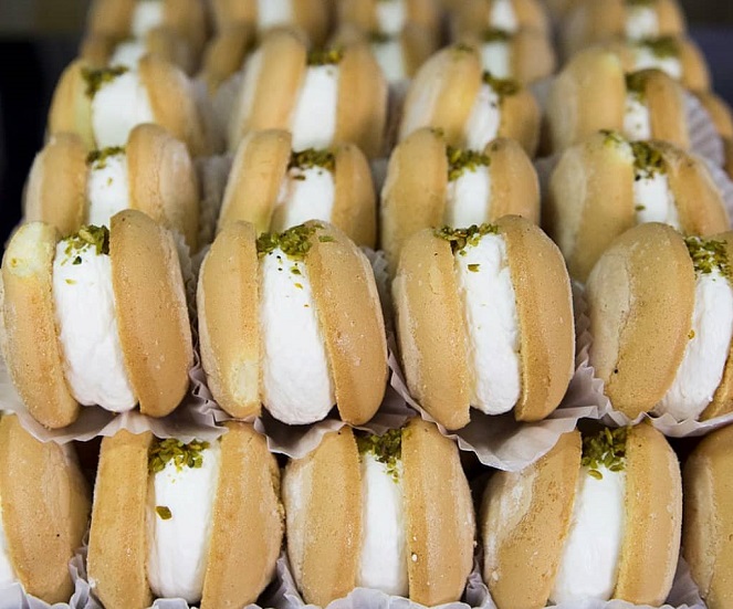 5- سینی فر رو داخل طبقه وسط فر قرار بدین و دمای فر رو روی 160 درجه قرار بدین و به مدت 10 الی 15 دقیقه صبر کنید تا زير نان ها طلايی شود، سپس سینی رو از فر در بیارین و بذارین تا نون ها خنک بشن بعد خامه فرم گرفته رو داخل یک قیف بریزید و روی یک طرف از نان ها خامه بریزین و بعد نان دیگه رو روی نان اول قرار بدید و با مقداری خلال یا پودر پسته تزئین کنید، شیرینی ها رو حتما داخل یخچال نگهداری کنید.