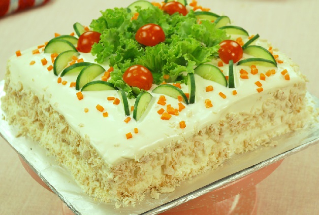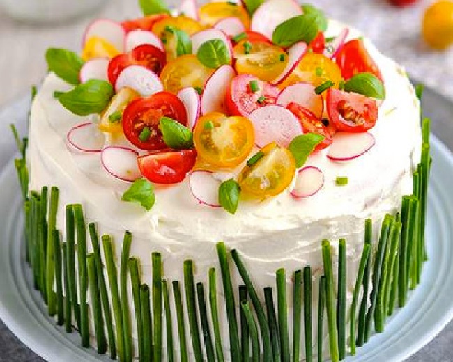 6- روی کیک را با انواع سبزیجات مانند: ذرت، نخود فرنگی، هویج، شوید یا جعفری خرد شده، خیار حلقه ای، زیتون حلقه ای، گوجه فرنگی یا هر چیزی که خودتان دوست دارید تزیین کنید و به مدت 2 الی 3 ساعت در یخچال قرار دهید بعد نوش جان کنید.