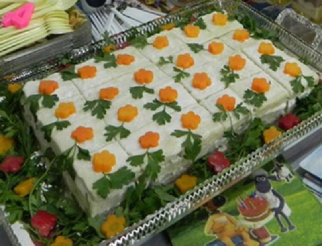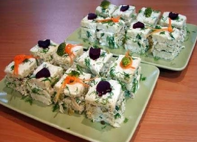 6- میتوانید نان تست را بعد از بریدن کناره هایش، به شکل مثلث برش بزنید و سالاد مرغ رو بین 3 عدد از نان ها قرار دهید و روی آن را به دلخواه تزیین کرده و زیرش کاغذ شیرینی قرار دهید تا شبیه شیرینی تر بشود.