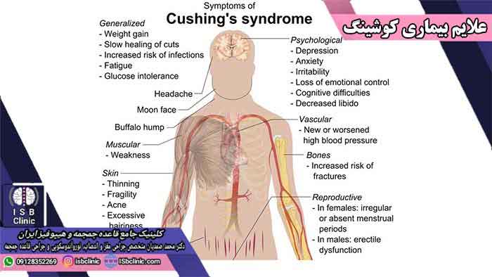 علایم بیماری کوشینگ طیف وسیعی از موارد را شامل می شوند که برخی از آنها عمومی و برخی از آنها مختص مردان و یا زنان هستند. به گفته دکتر محمد صمدیان استاد برتر جراحی مغز و اعصاب تهران در کلینیک جامع قاعده جمجمه و هیپوفیز ایران، علایم عمومی بیماری کوشینگ عبارتند از: