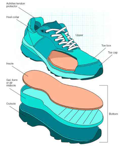 یک کفش مناسب پیاده روی، از قسمتهای مختلفی تشکیل شده است. هر کدام از این قسمتها باعث تحقق سه ویژگی مهم کفش پیاده روی (راحتی، انعطافپذیری، ثبات) خواهند شد.