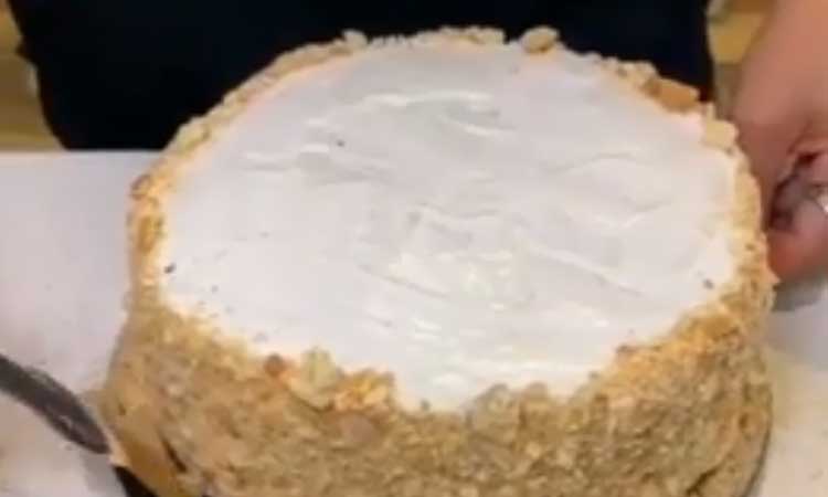 4- بعد از اینکه لایه آخر رو گذاشتین، روی نان ها سس مایونز بریزین، قالب رو بذارید یخچال تا مواد و نان کاملا خودشون رو بگیرن، بعد از حدود 3 الی 4 ساعت قالب رو از یخچال دربیارین و کیک رو از قالب خارج کنید و اطراف کیک رو با سس مایونز به صورت مرتب بپوشونید بعد دور کیک رو با کناره های نان تست که کاملا پودر کردید تزیین کنید.